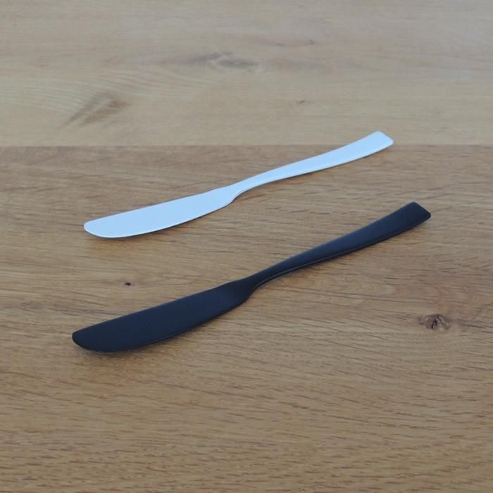 金属製洋食器の産地、新潟県燕市にて古くからステンレス製の業務用食器を製造している テノールワークス社 の "白黒カトラリー" バターナイフ。
