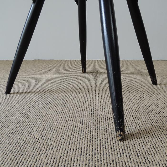 座面と背もたれはクリア、脚部は黒塗装が施されているため、サンディングは行わず、クリーニングのみ行なっています。 全体に傷、クリーニングで落としきれない染み、脚部のペイントロスなどはございますが、ヴィンテージらしさが凝縮された趣のある雰囲気です。 脚部接合部の緩みは組み直しと再接着をしておりますので、ガタつきもなく日常使いしていただけます。