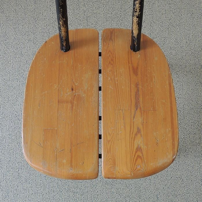 素材にもフィンランド特産の木材を選び、座面と背もたれはデザイナーズプロダクトでは用いられることの少ないパイン材(松)、フレームにはバーチ材(白樺)が使われています。 2枚の板を木製ダボで繋いだ座面は、パイン材の木調にクラフト感が上手に調和し、プリミティブな印象。 それでいて、座面の木口には内側に傾斜をつけてカットがされているため、野暮ったさはなく、表情は軽やか。 日常の中から常に新しい素材やアイデアを探し、革新的なデザインを追求した タピヴァーラ の哲学が色濃く反映されています。 デザインを手がけた時代は、フィンランドにとって戦後の厳しい状況下。 限られた資源を有効活用し、コストを削減するための措置として取り入れた側面もあったのではないのでしょうか。